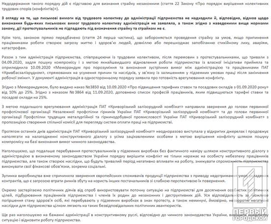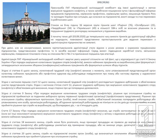 «Учитывая то, что письменные требования от трудового коллектива к администрации предприятия не поступали и, соответственно, отказов по выполнению любых письменных требований трудового коллектива администрация не заявляла, а также в соответствии с вышеуказанными нормами закона, действия протестующих не подпадают под определение забастовки и забастовкой не является», – идёт речь в пресс-релизе. Кроме того, менеджеры КЖРК снимают с себя ответственность за жизнь и здоровье людей, которые уже две недели находятся в забое, и считает их, и всех, кто их поддерживает, политическими авантюристами.