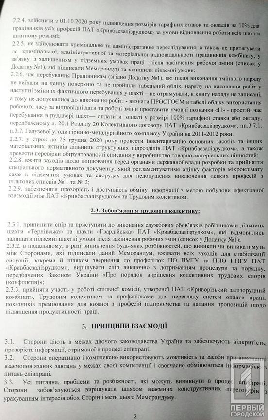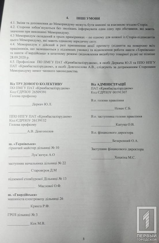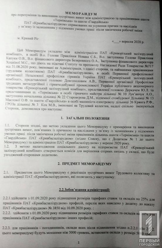 В сети появились фото Меморандума о взаимопонимании и исполнении встречных требований между администрацией и работниками шахт «Гвардейская» и «Терновская», находящихся в ведомстве КЖРК. Руководство предприятия настаивает на своих условиях – работникам тарифные ставки и оклады повысят не больше, чем на 25%. Текст документа опубликовал глава Независимого профсоюза горняков Украины Михаил Волынец.