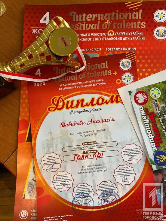 4 октября в столице на территории Киево-Печерской Лавры состоялся международный фестиваль «Талановиті діти України». Его участники соревновались в нескольких видах искусств – театральном, цирковом, хореографии, музыки, вокале и других. Кривой Рог на конкурсе представляли вокалистки, ученицы вокальной школы «НотаМи» под руководством Яны Чистиковой. Анастасия Давыдова и Полина Индюченко взяли два Гран-при фестиваля в своих возрастных категориях – средней и младшей. А Елизавета Глинка и София Корниенко стали лауреатами I и II премий.