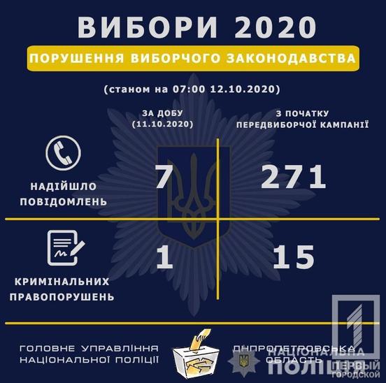 За прошедшие сутки полиция Днепропетровщины получила семь новых сообщений о нарушении избирательного законодательства. Правоохранители составили два административных протокола и открыли одно уголовное производство.