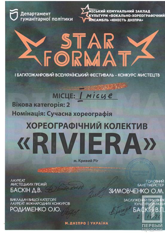 Воспитанницы Центра детского и юношеского творчества «Мрія» представили на фестивале-конкурсе номер под названием «Нарисуй» и получили высокие оценки от жюри. Девочки удостоились первого места. Хореографический коллектив Riviera к конкурсу готовили художественные руководители Юлия Медведева и Валентина Корякина.