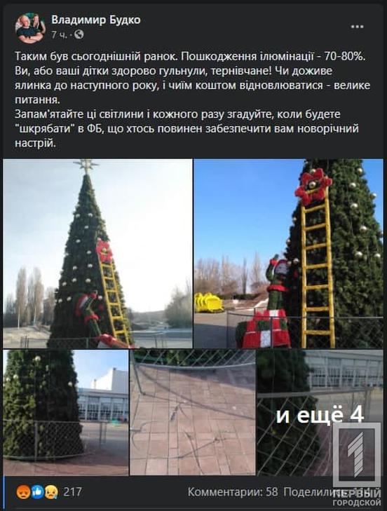 Утром 10 января перед жителями Терновского района предстала неприятная картина – одна из главных праздничных ёлок северной части Кривого Рога пострадала от рук вандалов. Неизвестные повредили порядка 70-80% иллюминации, которая украшала новогоднее дерево в тёмное время суток. Фотографии пакости на странице ДК «Северный» разместил Владимир Будко.