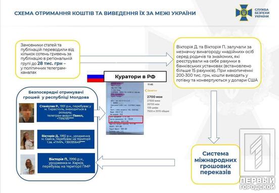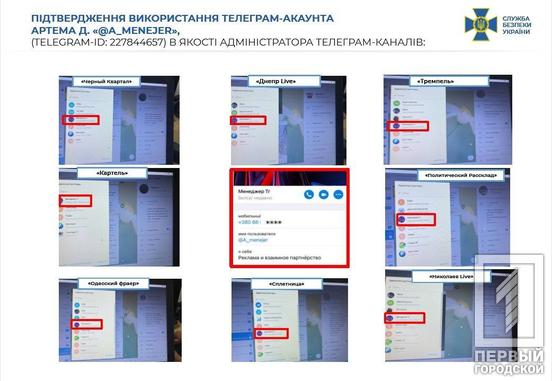Сотрудники службы безопасности установили, что «главным менеджером» является житель Одессы, который входит в число организаторов массовых беспорядков во время одесского «Антимайдана». Правонарушитель лично занимается двенадцатью Telegram-каналами – общается с заказчиками материалов, отчитывается перед российскими кураторами и согласовывает возможность размещения материалов стоимостью от нескольких сотен в региональных и до 25-30 тысяч гривен на всеукраинских каналах. Его разыскивают правоохранительные органы по нескольким статьям УК Украины. В число 12 Telegram-каналов входил «Кривой Рог онлайн».