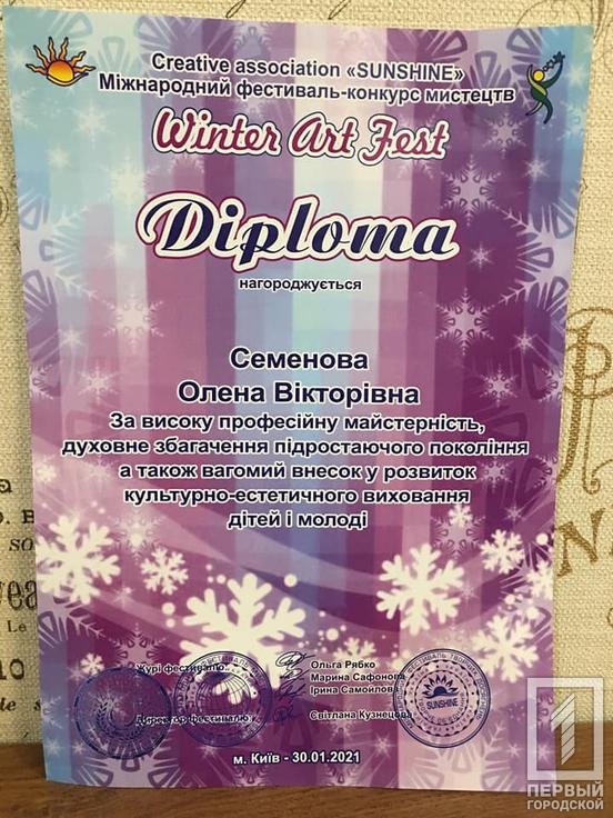 Ярослава Овсянникова заняла первое место, а курировала талантливую криворожанку Елена Семенова, концертмейстером была Ирина Мальчевская. Воспитанница музыкальной школы получила кубок и два диплома лауреата I степени за исполнение песен «Чарівна квітка» и «Лесной бал», а её руководитель – благодарственный диплом «За высокое профессиональное мастерство, духовное обогащение подрастающего поколения, а также весомый вклад в развитие культурно-эстрадного воспитания детей и молодежи». Ярослава одержала победу в фестивале в номинации академический вокал, возрастная категория – от семи до девяти лет.