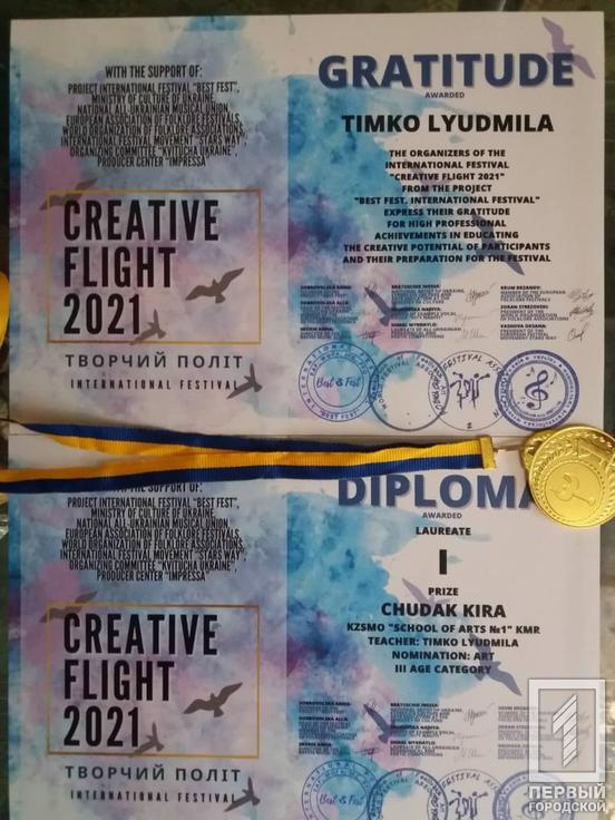 Ученики художественного отдела присоединились к участию в двух международных фестивалях и во всеукраинском конкурсе. Первое место в Международном дистанционном фестиваль-конкурсе CREATIVE FLIGHT-2021 заняла Кира Чудак. Курировала ученицу школы преподаватель Людмила Тимко.
