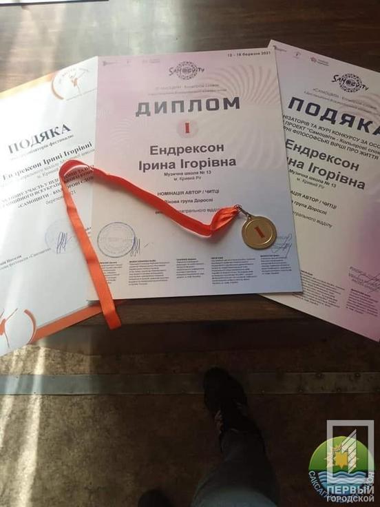 Получили награды фестиваля воспитанники театрального отдела Криворожской музыкальной школы №13. Творческим наставником ребят является преподаватель Ирина Эндрексон. В номинации «Авторская поэзия» Виолетта Трандина получила наивысшую награду – Гран-при, Катерина Ягозинская заняла первое призовое место, Ирина Эндрексон также получила диплом о занятом первом месте, но с отличием.