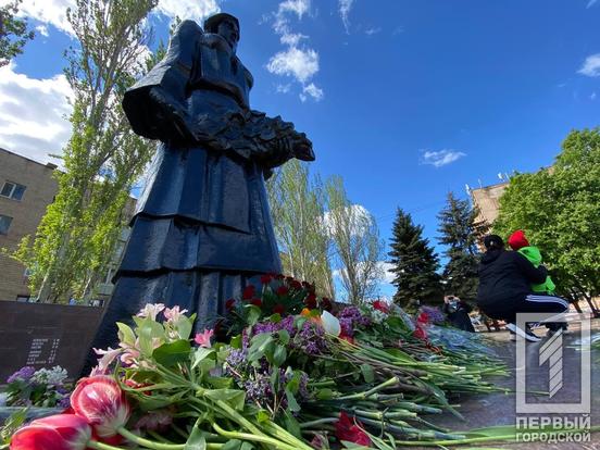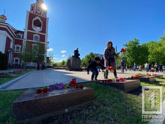 В Саксаганском районе с самого утра горожане возлагают цветы к Вечному огню на улице Владимира Великого. Люди приходят семьями, приносят портреты воевавших предков и вчитываются в имена павших бойцов, выгравированные на плитах братской могилы.