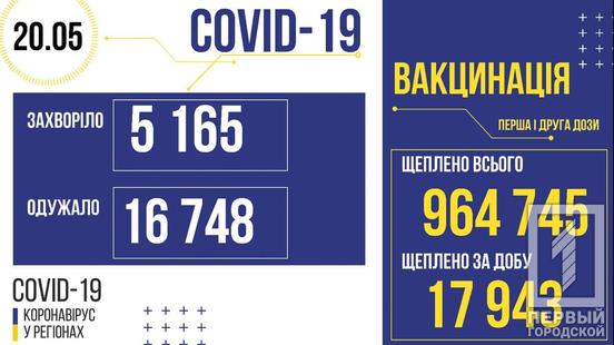 По состоянию на 8:00 20 мая в Украине зарегистрировали 2 170 398 случаев заражения коронавирусом, 48 899 человек умерли, 1 916 194 выздоровели. За минувшие сутки COVID-19 обнаружили у 5 165 человек, в том числе 324 детей и 109 медиков, 203 пациента скончались, 16 748 вылечились.