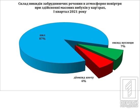В течение первого квартала этого года промпредприятия города провели 46 массовых взрывов в карьерах. Вследствие этого, 663 тонны вредных для организма человека веществ попало в атмосферу Кривого Рога. В частности, из этого количества 575 тонн составили выбросы пыли, 49 тонн – оксида углерода, 39 тонн – диоксида азота. Тем не менее, промышленные предприятия осуществляли специальные работы по сокращению возможности попадания в воздух загрязняющих веществ при проведении взрывов и таким образом удалось предотвратить количество выбросов почти на 2,5 тысячи тонн.