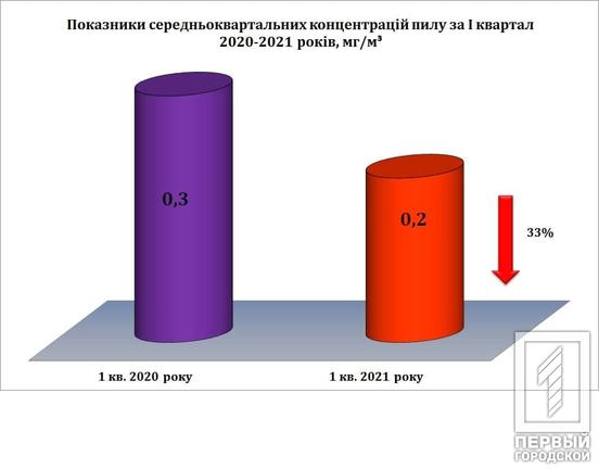 Согласно данным «Лаборатории наблюдений за состоянием атмосферного воздуха Кривого Рога», по сравнению с первыми четырьмя месяцами 2020 года, в 2021 показатели среднеквартальных концентраций пыли и формальдегида снизились на 33% и 25% соответственно, но всё равно они превышают предельно допустимые показатели.