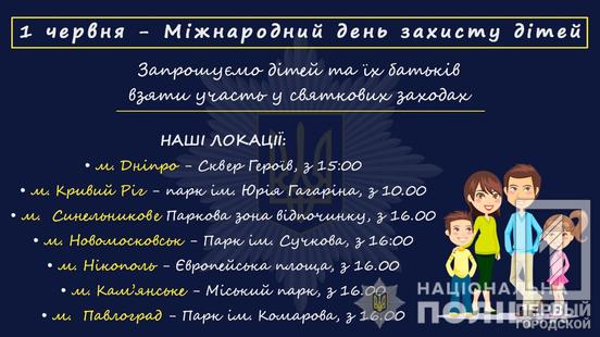1 июня полиция Днепропетровской области организовывает информационно-развлекательные праздники в честь Международного дня защиты детей. На локациях будут представители многих подразделений полиции. Об этом сообщает отдел коммуникации полиции Днепропетровской области.