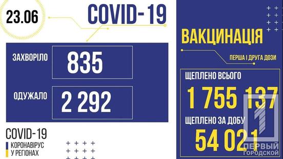 Станом на 8:00 23 червня в Україні зареєстровано 2 230 977 випадків зараження коронавірусом, 52 123 особи померли, 2 155 261 видужала. За минулу добу COVID-19 виявили у 835 осіб, в тому числі у 33 дітей і у 25 медиків, 70 пацієнтів померли, 2 292 вилікувалися.