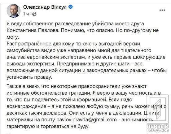 Олександр Вілкул написав: «Я веду власне розслідування вбивства мого друга Костянтина Павлова. Розумію, що небезпечно. Але по-іншому не можу. Поширюване для дуже вигідної комусь версії самогубства відео вже направлено мною для ретельного аналізу європейським експертам, і вже є перші шокуючі висновки експертизи. Роблю й інші кроки - всі можливі в даній ситуації і законодавчих рамках - щоб встановити правду».