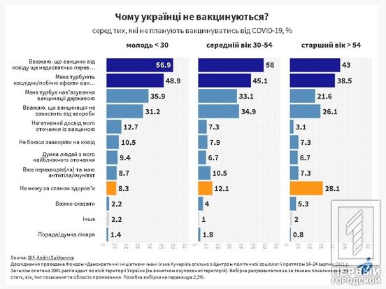 Фонд «Демократичні ініціативи» імені Ілька Кучеріва впродовж 14–24 серпня проводив опитування серед дорослого населення, щоб з'ясувати, якими є причини небажання українців вакцинуватися від COVID-19. Основними, на думку громадян, стали: небажання вакцинуватись від COVID-19 через недостатньо перевірені препарати (56,9%), страх перед наслідками та побічними ефектами вакцинації (48,9%) та нав’язування вакцинації державою (35,9%).