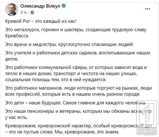 «Кривий Ріг - це кожен з нас! Це металурги, гірники і шахтарі, що створюють трудову славу Кривбасу. Це лікарі та медсестри, цілодобово рятують людей! Це вчителі і працівники дитячих садків, які виховують наших дітей. Це працівники комунальної сфери, від яких залежить вода і тепло в наших будинках, транспорт і чистота на наших вулицях, соціальна допомога тим, хто її потребує. Це люди усіх професій, які є в нашому дуже різному місті. Це діти - наше майбутнє. Найголовніше для кожної людини. Це наші пенсіонери і ветерани, яким ми зобов'язані всім, що у нас є. Криворіжці, криворізький характер, особливий криворізький дух - це не порожні слова. Ми, криворіжці, це знаємо»: сказав О.Вілкул.