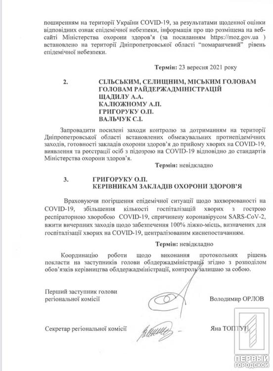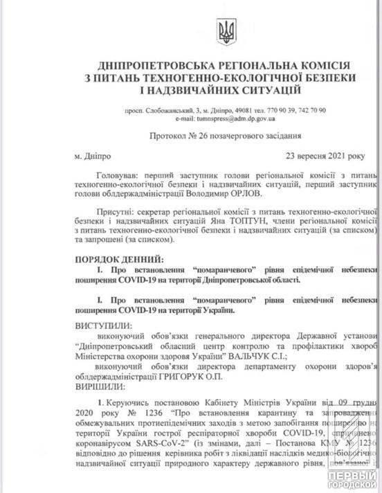 24 вересня на засіданні Державної комісії з питань техногенно-екологічної безпеки та надзвичайних ситуацій ухвалили рішення про встановлення на території області «помаранчевого» рівня епідемічної небезпеки. Буквально за один день Дніпропетровщина перейшла з «жовтої» до «помаранчевої» зони карантину через збільшення інфікованих коронавірусом.