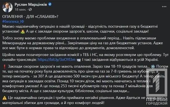 Мер Івано-Франківська Руслан Марцінків на своїй сторінці у Фейсбук повідомив, що лікарні міста не мають опалення. Це пов’язано з надзвичайно високими цінами на газ.