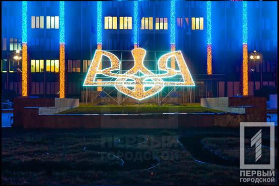 Біля міськвиконкому з’явився велетенський Герб України, у новорічні вогники вже переодягнули квітковий годинник.