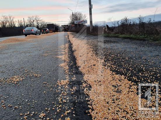 17 грудня трасою у бік виїзду з міста рухалась вантажівка. Водій перевозив кукурудзу. Не помітивши неполадок у кузові, водій тепер мусить збирати зерно, що висипалось із машини.