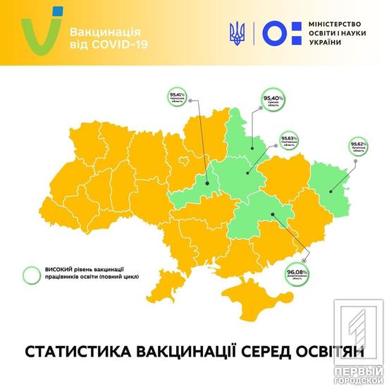 6 січня, співробітники МОН висвітлили рівень вакцинації від ковіду серед працівників закладів освіти. Так, до повного забезпечення вакцинами працівників шкіл, дитсадків, вищів залишилось недовго. Двома дозами щепилися найбільше освітян у таких областях: Дніпропетровській – 96,08%, Полтавській – 95,63%, Луганській – 95,62%, Черкаській – 95,41% та Сумській – 95,40%.