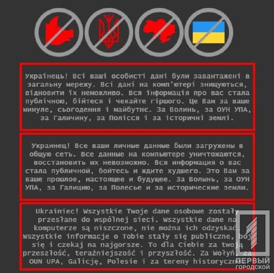 Крім того, на декількох сайтах розмістили наступне повідомлення: «Українець! Всі ваші особисті дані були завантажені в загальну мережу. Всі дані на комп’ютері знищуються, відновити їх неможливо. Вся інформація про вас стала публічною, бійтеся і чекайте гіршого. Це Вам за ваше минуле, сьогодення і майбутнє. За Волинь, за ОУН УПА, за Галичину, за Полісся і за історичні землі».