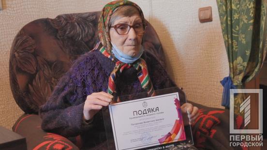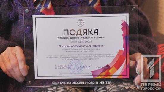 Від імені міської влади Валентині Іванівні вручили подяку за мужність і героїзм, проявлені в воєнні роки та за активну участь у розбудові міста. Її передав пані Валентині заступник міського голови Костянтин Бєліков, а Юрій Вілкул привітав довгожительку телефоном.