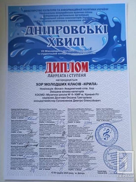 Протягом трьох днів у стінах Дніпропетровської академії музики ім. М. Глінки проходив міжнародний академічний конкурс учнівського та студентського музичного мистецтва «Дніпровські хвилі». Одними з конкурсантів стали вихованці криворізького хору молодших класів «Крила». Юні криворіжці обійшли суперників та здобули звання лауреата першого ступеня.