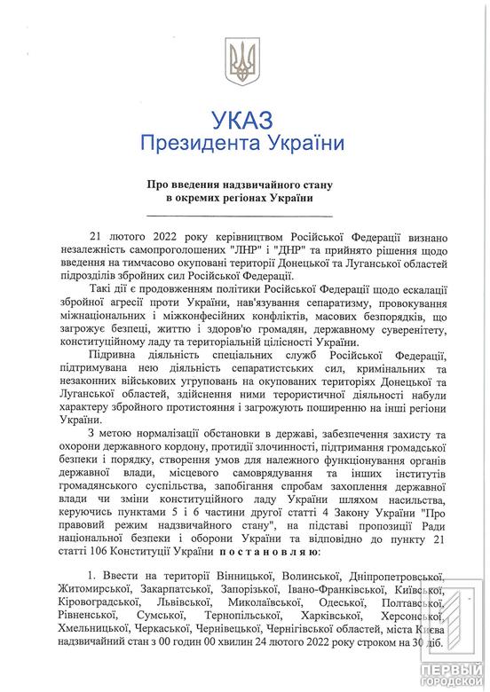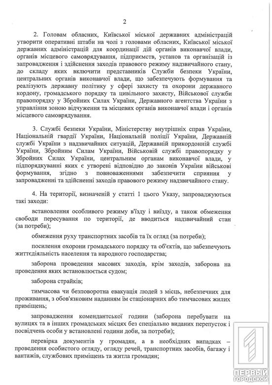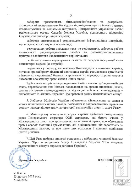 Відтак надзвичайний стан вступає в дію з настанням півночі 24 лютого та попередньо триватиме 30 діб. 1) встановлення особливого режиму в'їзду та виїзду, а також обмеження свободи пересування;