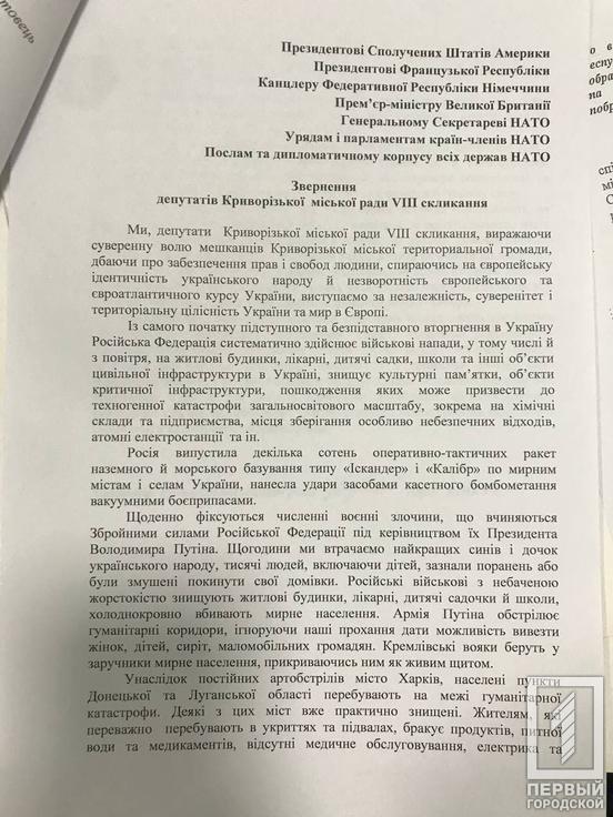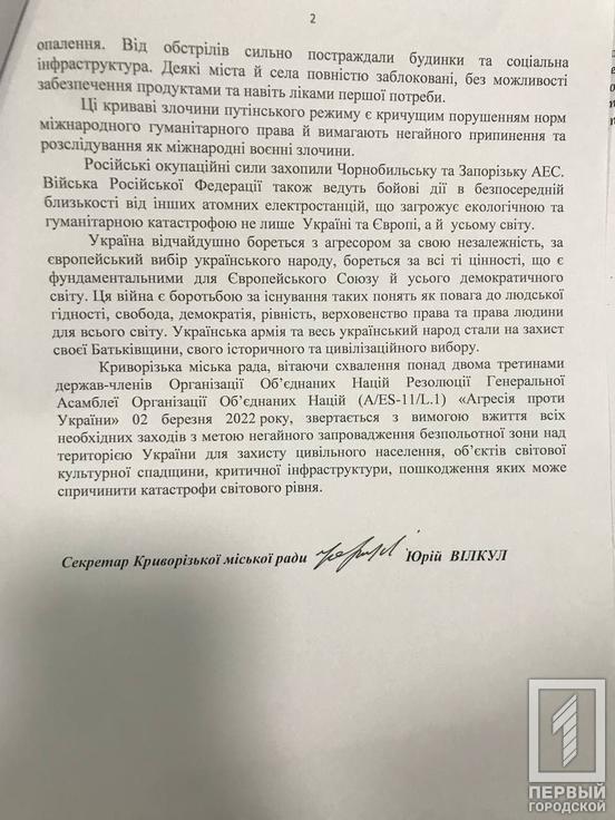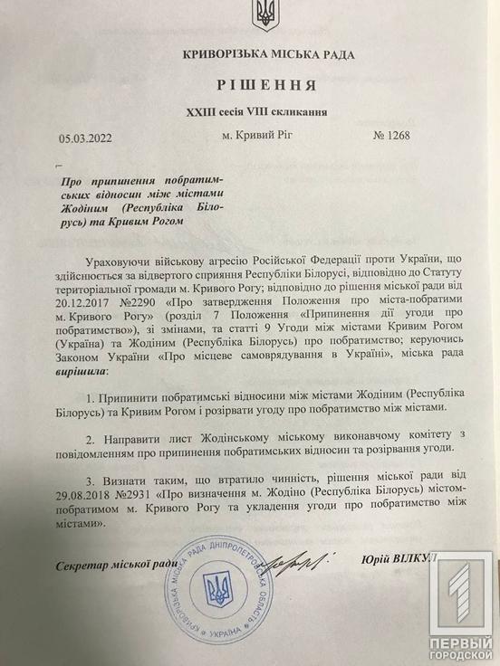 «Російська агресія на території нашої держави здійснюється за сприяння Республіки Білорусь. З території якої російські війська вторглися до України та здійснюють активні військові дії, у тому числі проти мирного народу. Загинули мирні люди, у тому числі і діти. Білоруські льотчики разом із російською ордою вбивають нас і знищують Україну. Це перекреслює наші багаторічні дружні відносини між народами. У зв’язку з цим вважаємо за необхідне негайно припинити побратимство між містами Кривий Ріг та Жодіно та розірвати угоду про побратимство». Обидва питання – звернення про термінове закриття неба над Україною і про розірвання побратимських стосунків із білоруським Жодіно депутати міської ради підтримали одноголосно.