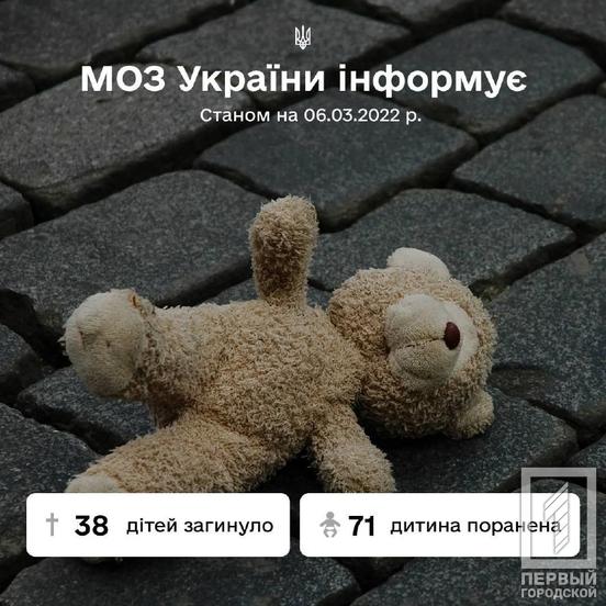 Станом на 12:00 6 березня, від початку вторгнення РФ на територію України, загинуло 38 дітей, 71 дитина отримала поранення. Ці дані не можна вважати точними, адже наразі неможливо встановити кількість поранених та вбитих в Маріуполі Донецької області та в Ірпені на Київщині. Інформацію повідомила Людмила Денісова, уповноважена Верховної Ради з прав людини.
