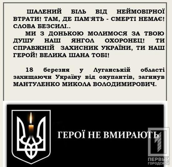 «Ми з донькою молимося за твою душу, наш янгол-охоронець! Ти справжній захисник України, ти наш герой! Велика шана тобі!», - написала Світлана Мантуленко. Редакція «Першого Міського» висловлює щирі співчуття рідним нашого Захисника та шанує його подвиг.