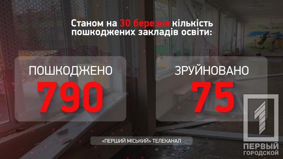 Крім того, через постійні обстріли окупантів пошкоджено вже 790 закладів освіти, 75 з яких зруйновано повністю. Більш за все влучають у навчальні заклади в Донецькій, Харківській, Миколаївській, Сумській, Київській, Херсонській, Чернігівській областях та місті Київ.