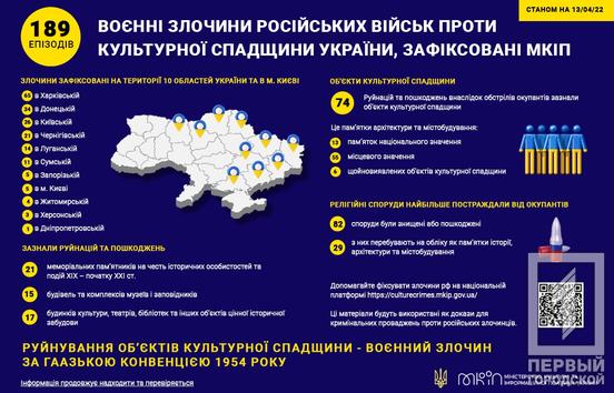 Станом на 13 квітня військові рф скоїли 189 злочинів проти культурної спадщини України. Зокрема, пошкоджені або повністю зруйновані релігійні споруди, музеї, будинки культури, заповідники та театри. Найбільше руйнувань зазнали культурні об’єкти на Харківщині. Інформація про це з’явилась на офіційному сайті Міністерства культури та інформаційної політики України.