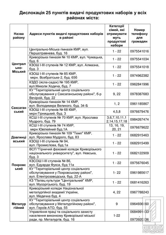 З організації роботи пунктів видачі продуктових наборів, можна звертатися за телефонами, які указані в дислокації, а також до Контакт центру за телефоном 15-20 та 056-499-15-20 або на сайт https://spilkuisia.kr.gov.ua.