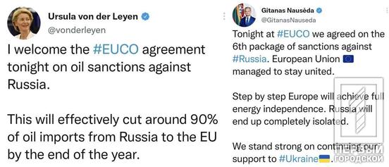 Загалом, шостий пакет санкцій передбачає шість основних положень, середи них заборона на імпорт нафти морем, через порти. Даний імпорт становить 2/3 тієї нафти і нафтопродуктів, що росія продає до країн ЄС. Між тим, заборона тимчасово не торкнеться імпорту по нафтопроводу. Але завдяки новому пакету санкцій, за словами голови Єврокомісії Урсули фон дер Ляєн, Євросоюз планує до кінця цього року відмовитися від 90% нафтового імпорту з росії.