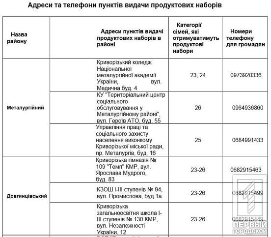 Криворіжці можуть отримати продуктові набори щоденно, в робочі та вихідні дні з 8:00 до 17:00 години у 28 пунктах видачі (список з адресами та телефонами пунктів додається нижче).