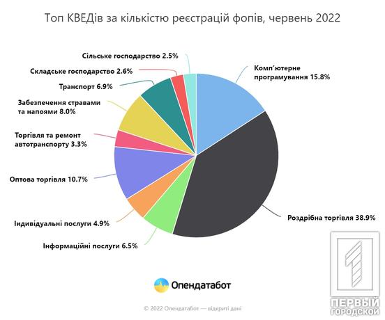 Крім того, від початку повномасштабного вторгнення змінилась географія реєстрацій нових компаній. Зокрема, у Києві з' явилось 533 ФОПа, у Львівській області 305, а на Дніпропетровщині ‒ 301. Змінились й напрямки діяльності малого та середнього бізнесів. Зокрема, на першому місці серед нових підприємців є сфера роздрібної торгівлі. Вона склала 37% від усіх нових ФОПів у червні.