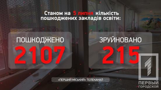 Крім того, в результаті постійних ворожих обстрілів і бомбардувань українських міст і селищ руйнується цивільна інфраструктура – житлові будинки, заклади освіти та культури, медичні установи тощо. Зокрема, через дії рашистів в Україні пошкоджено 2107 навчальних закладів, з яких 215 розтрощені вщент й не підлягають відновленню.