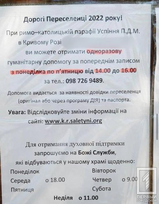 Католицька громада Кривого Рогу надає допомогу виключно внутрішнім переселенцям, яким довелось залишити свої домівки й тікати від жахів війни. Загалом українцям надають пакунки, в яких традиційно є продукти довготривалого зберігання, консерви, крупи, макарони, а також гігієнічні засоби – гелі мило, шампуні, креми, підгузки тощо. Самі пакунки умовно поділяють за віком – видають їх з розрахунком на родину з дитиною віком до двох років, переселенцям до 18 років і повнолітнім українцям.