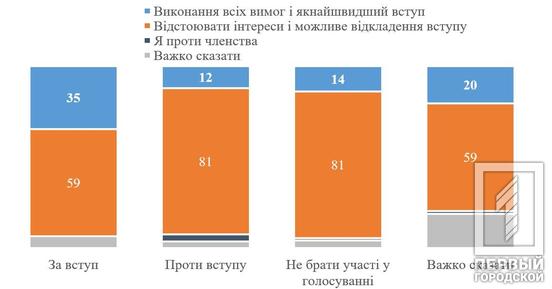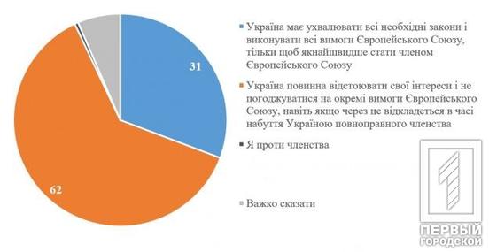 Водночас, 31% респондентів вважає, що Україна має ухвалювати всі необхідні закони та виконувати всі вимоги ЄС, щоб якнайшвидше стати членом організації.