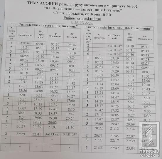 З 27 червня на міські маршрути повернули автобуси, зокрема №244, №302, №4, а з 1 липня відновили курсування транспорту №228 і №228а. Але нещодавно стало відомо про коригування розкладу руху автобусу №302. Зокрема, з 28 липня останній рейс комунального транспорту з площі Визволення відправлятиметься на вісім хвилин раніше ‒ в 20:27 (замість 20:35). Тепер автобус прибуватиме до кінцевої зупинки на Інгулець в 21:50. Причиною змін розкладу є те, що раніше містяни не мали змоги вчасно дібратися додому до настання комендантської години.