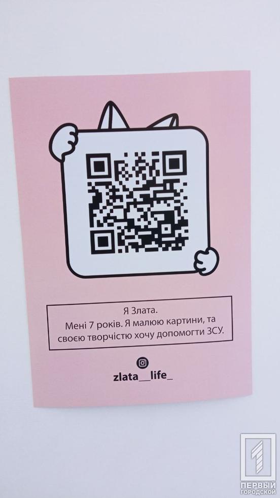 «Златочка завжди любила малювати. Як почала тримати пензлі, то використовувала яскраві фарби. Згодом почали займатися з викладачами, які нас дуже підтримали у створенні цієї виставки. І Злата вирішила, що свій талант, своє вміння вона може направити на допомогу. Цю експозицію вона хотіла зробити різноманітною, щоб кожен знайшов картину для своєї душі. Злата багато намалювала патріотичних картин, зобразила й котиків, адже вона їх полюбляє», ‒ відзначила мама юної криворізької зірочки пані Світлана.