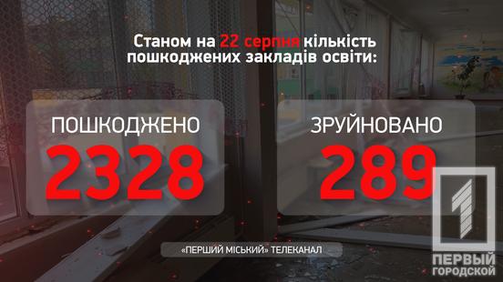 Поза тим, постійно атакують загарбники й навчальні заклади України. З початку війни пошкоджені вже 2328 закладів освіти, з яких 289 зруйновані повністю.