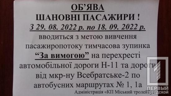 Незабаром у нашому місті для автобусних маршрутів №1 та №1А введуть зупинку «на вимогу», аби перевірити пасажиропотік. Три тижні з’ясовуватимуть чи користується попитом нова зупинка, аби вирішити чи варто вводити її на регулярній основі. Про це повідомляється на сторінці «Транспорт Кривого Рогу» у соцмережах.