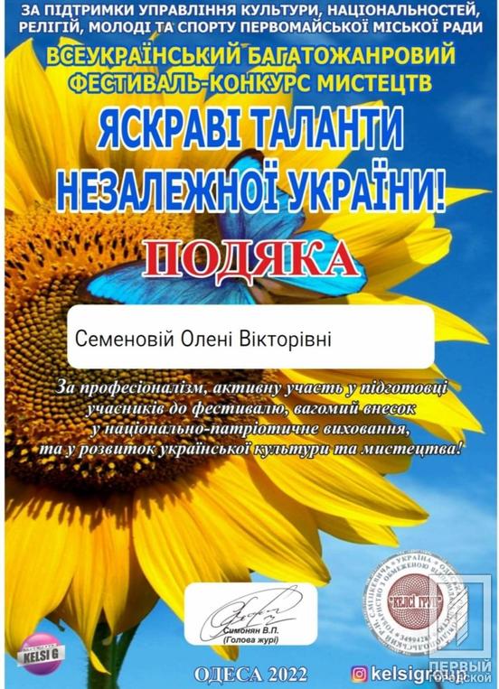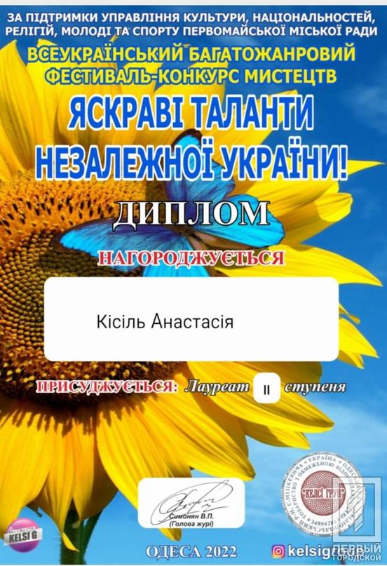 Всеукраїнський багатожанровий фестиваль-конкурс мистецтв «Яскраві таланти незалежної України» провели у Одесі. Долучились до творчих змагань юні мітці з різних куточків держави. За першість змагались у відповідних вікових категоріях та дисциплінах. Наше місто представляла вихованка вокально-теоретичного відділу Музичної школи №5. Анастасія Кісіль вдало розкрила свій талант під час виступу, за що й посіла друге місце. Викладачем дівчини є Олена Семенова.