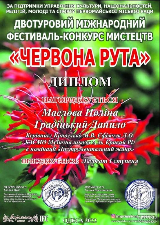 Поза тим, у Одесі також тривав і Міжнародний фестиваль-конкурс «Червона рута». До нього традиційно долучились юні митці різного віку й у відповідних номінаціях. Продемонструвала свою майстерність і вихованці відділу народних інструментів Музичної школи №5. Дует Поліни Маслової і Данила Градіцького здобув перше місце у межах конкурсу. Творчими наставниками переможців є Людмила Єфімчук і Майя Кривулько.