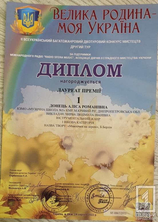 Перші місця посіли юні музиканти з Кривого Рогу на Всеукраїнському конкурсі мистецтв «Велика родина моя Україна»