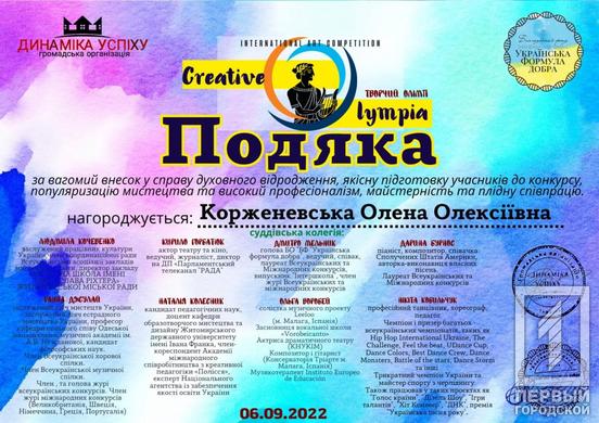 6 вересня провели Міжнародний творчій конкурс Creative Olympia. За першість на фестивалі змагалось багато талановитих виконавців та творчих колективів, які виступали у відповідних вікових категоріях та номінаціях. У конкурсі брав участь і квартет «Марічка», вокалісти якого дуже вдало продемонстрували свої здібності. За результатами, криворізький колектив нагородили Гран-прі в п’ятій віковій категорії та номінації «Вокал». Творчим наставником є Олена Корженевська.