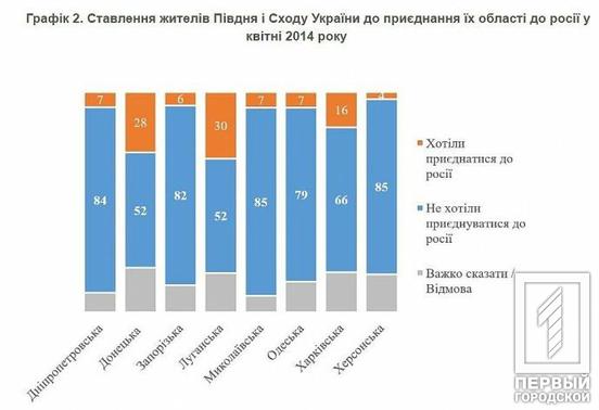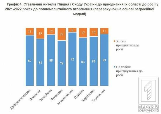 Таким чином, на Донеччині 81% населення проти приєднання до рф, на Луганщині 78%, у Харківській області – 85%, Запорізькій – 88%, Херсонській – 89%, на Дніпропетровщині – 87%.