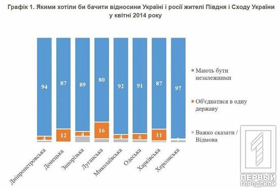Відповідаючи на питання: «Якими б ви хотіли бачити відносини України з Росією?» у квітні 2014 року більшість людей виступали виключно за незалежність України. У Луганській області лише 16% хотіли б «об’єднатися з росією у одну державу» проти 80%, які виступали за незалежність, у Донецькій області 12% проти 87% і на Харківщині 11% проти 87%, на Дніпропетровщині 4% проти 94%.